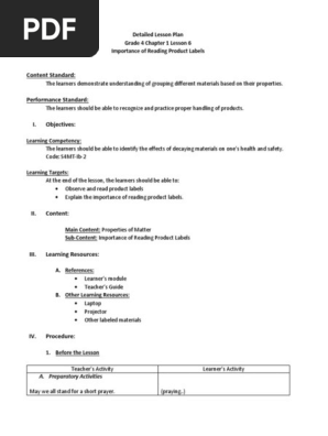 G.4 Reading food labels lesson plan - SEMI- DETAILED LESSON PLAN IN ... SEMI- DETAILED LESSON PLAN IN HEALTH READING FOOD LABELS. I. Learning Objectives: Upon completion of this lesson, students will be able to: a. Understand the importance of reading food labels in selecting healthier and safer food through class discussions. b. Identify the different components of food labels through class discussion.